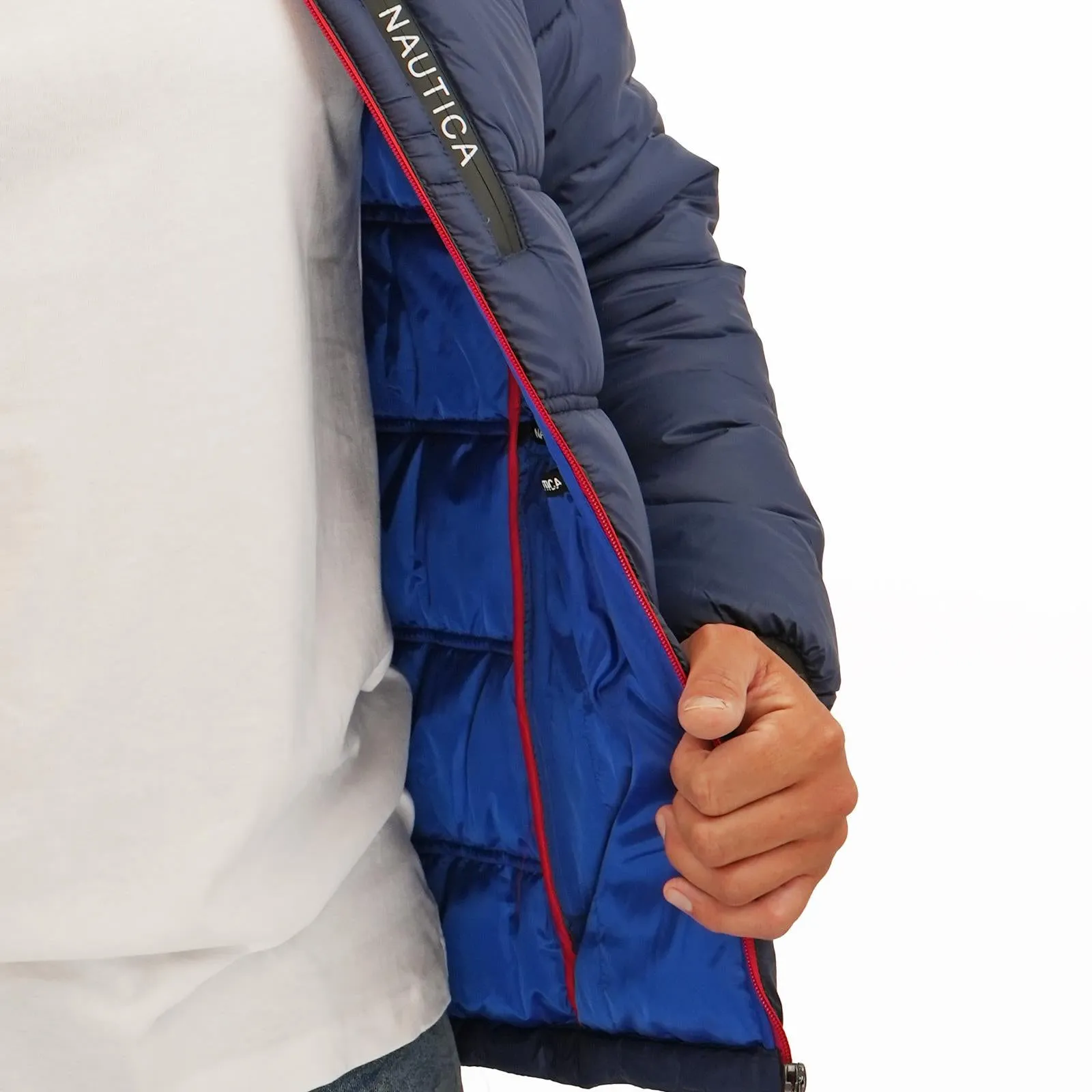 A padded jacket with horizontal quilting, featuring side pockets and one breast pocket with zip on the outside and one inside (no zip). N85 logo to the arm.